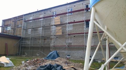 Na pôvodnej budove je potrebné odstrániť 100 % existujúcej vonkajšej omietky opatrenej náterom Dikoplast.